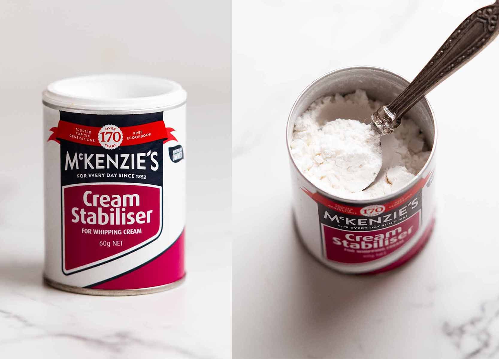 Cream stabiliser – Fairly new offering in Australian grocery stores, this is a store bought flavourless powder that you just add into the cream then whip together. I use McKenzie’s brand, sold in the baking aisle of regular grocery stores. Probably my most used method these days, for sheer convenience. This has become a pantry essential!