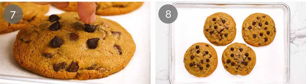 Decorate – Working quickly, press extra chocolate chips on the surface. I like to press them in slightly, some straight, some wonky. But even if you just place them on top, the heat will melt the chocolate so they bond.