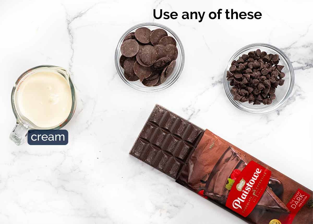Do not use eating chocolate from the confectionary aisle (it’s designed not to melt!). If you want to use milk or white chocolate, see my chocolate ganache recipe for the right cream-to-chocolate ratios. 70% cocoa (bittersweet chocolate) will also work but the ganache is not quite as sweet, personally I prefer dark chocolate.