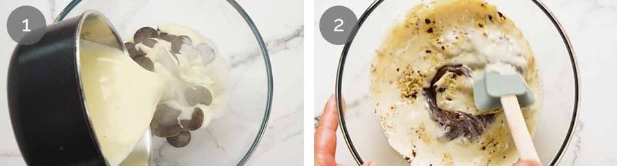 Mix with a rubber spatula until the cream and chocolate are combined to make a runny, shiny molten chocolate mixture. It will take about a minute as cream and chocolate are not natural friends, however, they will combine.